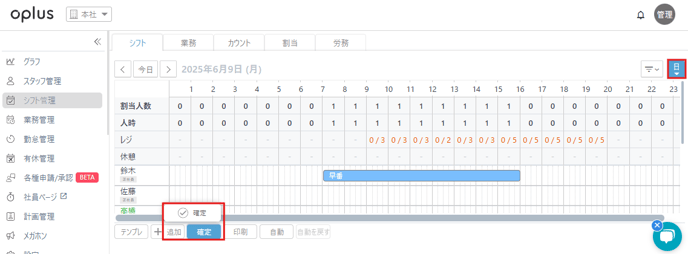 ・シフト管理画面にて「確定」したいシフトをクリック