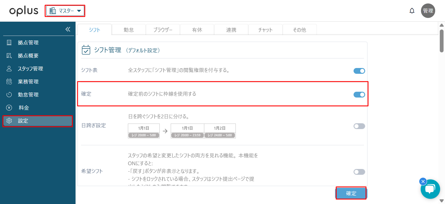 ・マスター>設定>シフトタブを開く