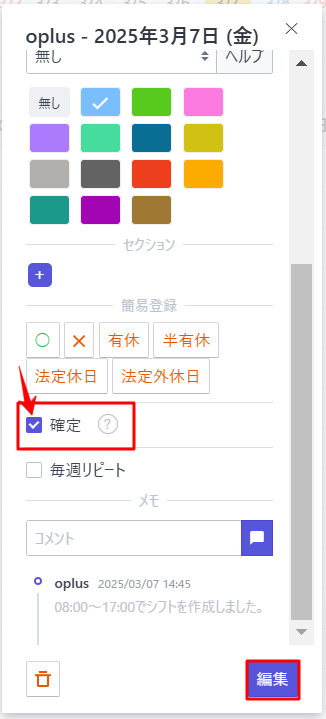 下記画面が表示されますので「確定」をクリックしていただくとチェックマークが付き、その後「編集」を押すとシフトが確定します。
