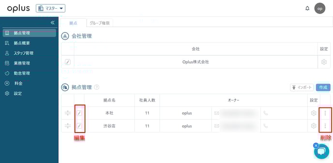 また会社管理(会社名の編集)もこちらの拠点管理にて編集が可能です。