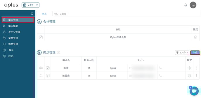 ・拠点管理の欄にある「作成」をクリック