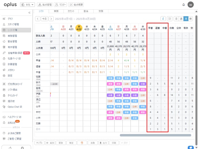 <カウントをシフト表に表示機能で可視化できること>