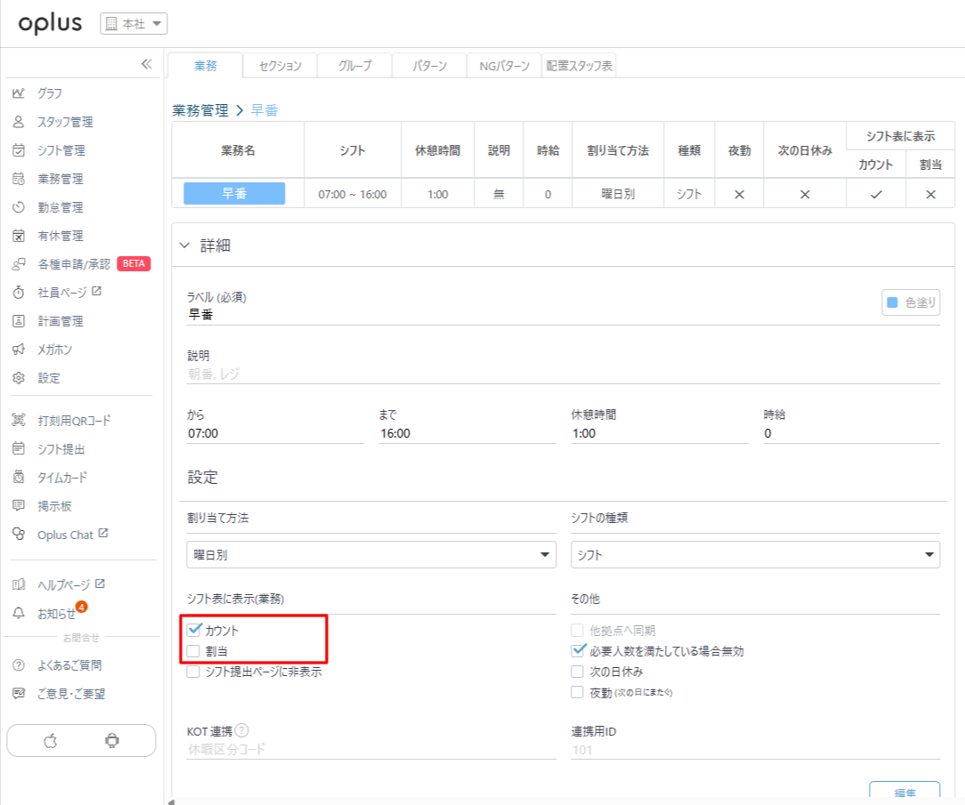 ・詳細>シフト表に表示(業務)の欄にある、「カウント」と「割当」にチェックをいれる