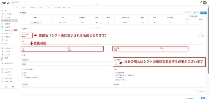 業務管理では主に1日の勤務パターン(早番や遅番)を登録いたします。