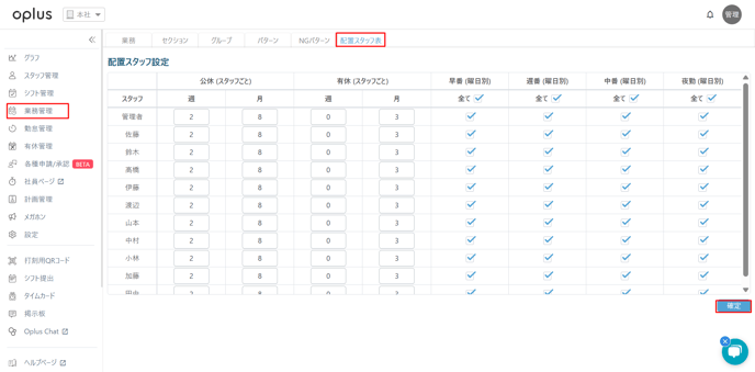 配置スタッフや日数の変更を行った場合は、右下の確定を押す必要がございますので、ご注意くださいませ。