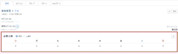 ・必要人数欄右上の鉛筆マークをクリックし、曜日ごとに必要な人数を登録する