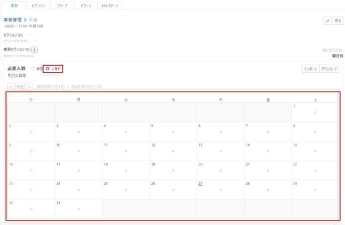 ・もしくは「上書き」を選択すると、特定の日付を指定して必要な人数を登録する