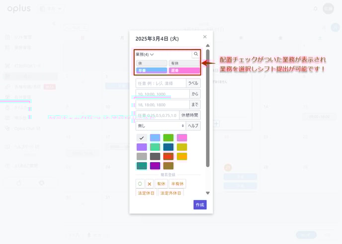 ※上記配置スタッフにチェックをいれることで、該当のスタッフ様のシフト提出画面にてシフト作成を行う際に、該当の業務を活用しシフトの提出が可能です。