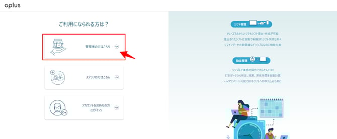 登録方法/トライアルについて 一部有料機能が使える30日の無料トライアルを実施しております。 こちらのリンクを開いていただき「管理者の方はこちら」からご登録くださいませ。 ※資料請求はこちらからお願いいたします。※デモツアーはこちらをご確認ください。 💡oplusにご登録後、自動で30日間のトライアルがスタートいたします。 画面上部にトライアル期間の残り日数が表示される仕様となっております。