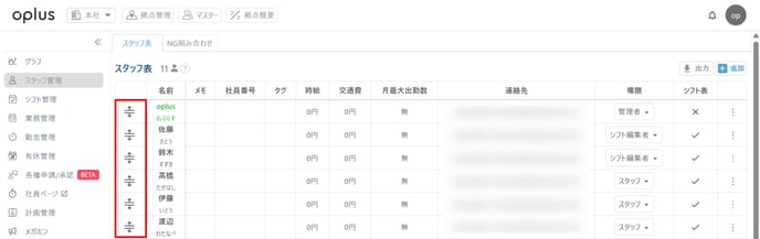 スタッフの並び変え 下記操作にてスタッフ様の並び順を変更することが可能です。 ・スタッフ管理を開く・並び替えをしたいスタッフ様の一番左の矢印をドラッグする ※並び替えを行うことでシフト管理やスタッフマスターの並び順にも反映いたします。 💡スタッフ登録数が25件を超え、ページを跨いで並び替えを行いたい場合、ページネーションの25件を「全て表示」に切り替えていただくことで並び替えが可能です。