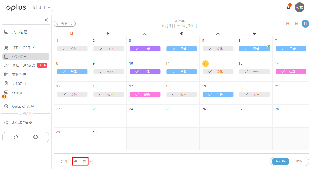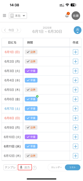 ・シフト提出画面下の「出力」をタップ