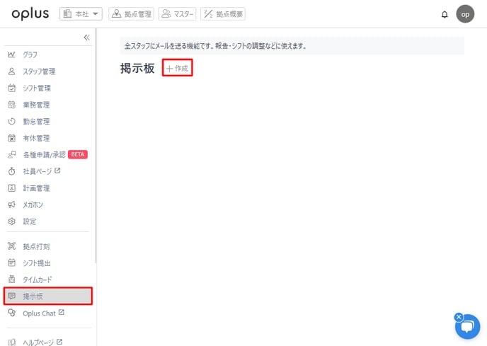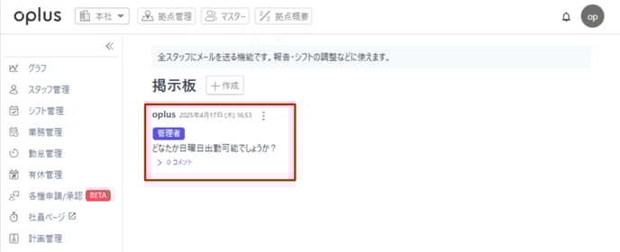 掲示板は権限を問わず、拠点に登録されているスタッフ皆様が双方向にコミュニケーションを行える機能となります。