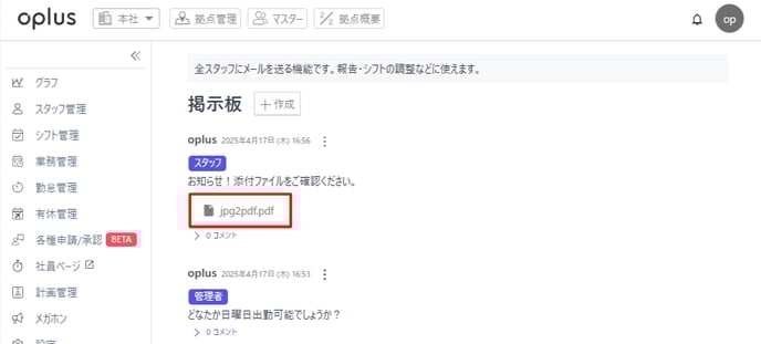 送信された掲示板の内容は、通知対象のユーザーでなくても対象拠点にいるスタッフ様は確認することが可能です。