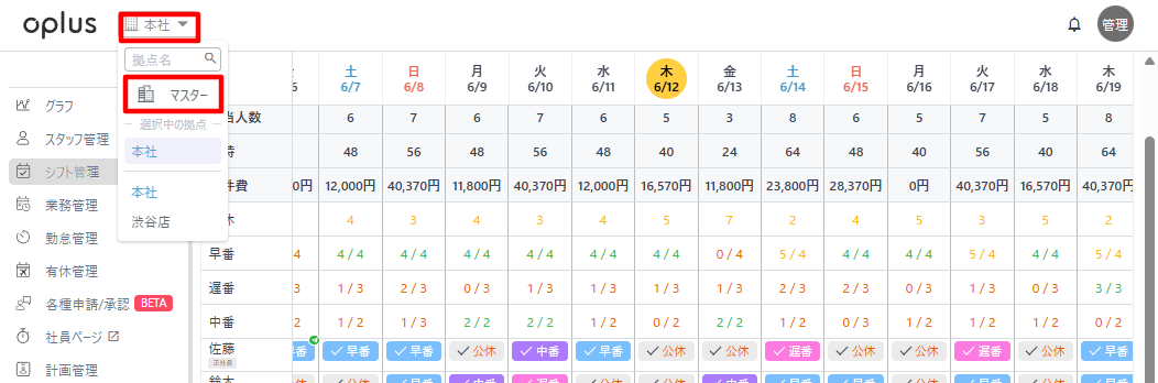 ・画面上部にある拠点名の記載がある「プルダウン>マスター」をクリック