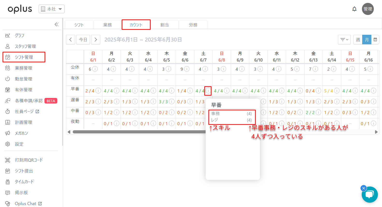 └シフト管理>カウントページの「i」マークを押すことで、どのスキルが何人入っているか確認が可能