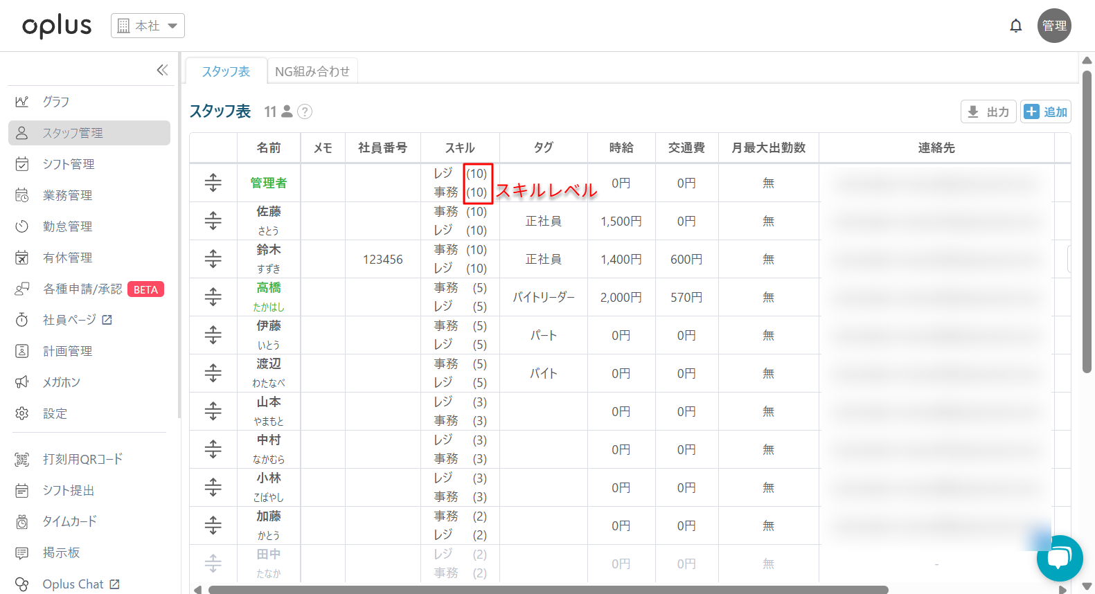 スタッフ管理にて、スタッフ毎にどのスキルが登録されているか確認が可能です。