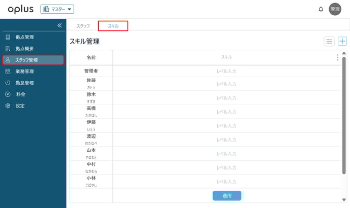 管理者権限の場合は、配置されている拠点のスタッフ様のみレベルの入力が可能です。