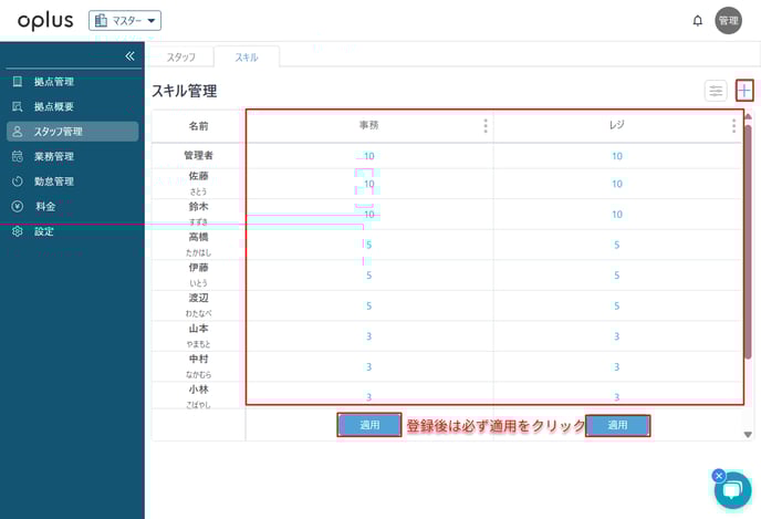 ・スタッフ管理(スタッフマスター)を開き、スキルタブをクリック