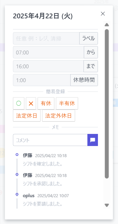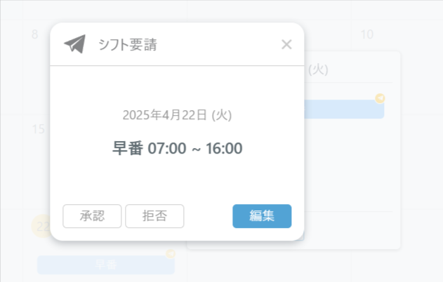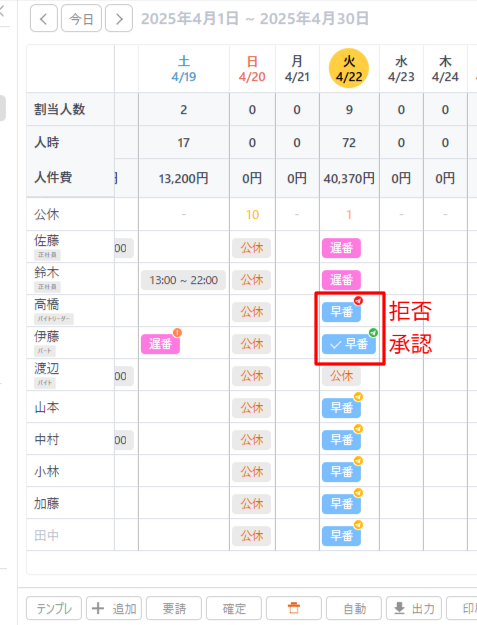 承認を行うと、確定シフトとなり、拒否を行うと、該当のシフトは削除されます。