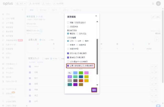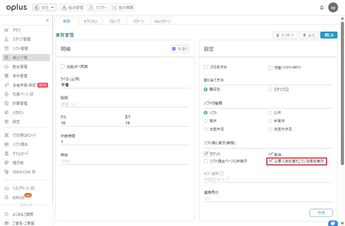 ・シフト表に表示(業務)欄にある「必要人数を満たしている場合無効」にチェックをいれる
