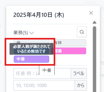 上記設定を行った業務がシフト提出されたり管理者様が入力をし必要人数が満たされた場合、下記のように表示され、シフト提出ができなくなる仕様となります。