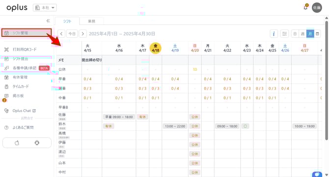 ※管理者とシフト編集者権限のみ確認することが可能となるため、スタッフ権限や閲覧者権限では確認できない機能となります。