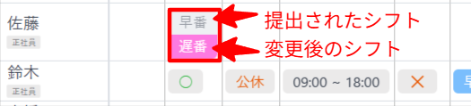 提出されたシフトが上に表示され、下に変更後のシフトが表示されます。