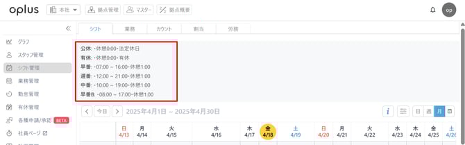 └シフト表の上に、業務名・業務の開始/終了時間・休憩時間の表示が可能です。