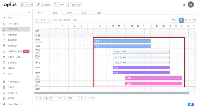 ・日表示:カレンダーを日表示にした際に、出勤時間が早い人順に並べられる