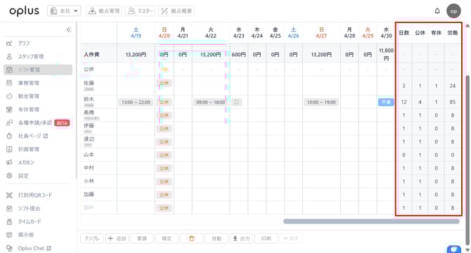 └表示している期間のシフトが入力されている日数や公休、労働時間の把握が可能です。