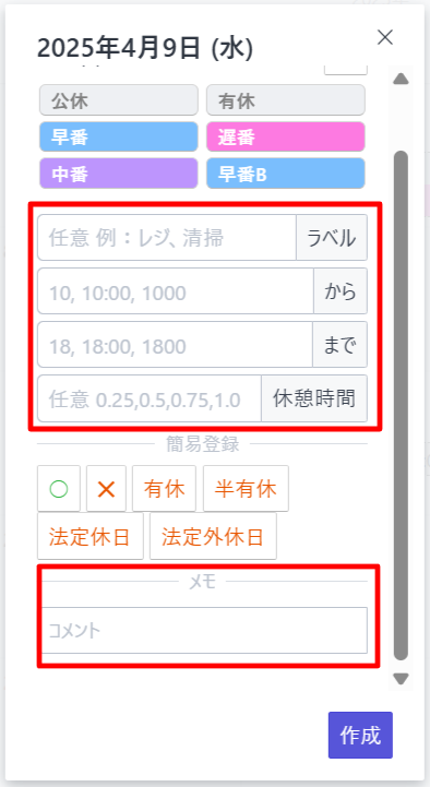 └スタッフのシフト提出画面にて簡易ボタンを非表示にすることが可能です。