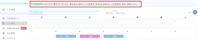 スタッフ権限や閲覧者権限で「シフト管理」を確認した際に確定されたシフトしか閲覧ができないような機能となります。