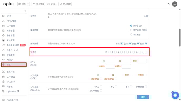 シフト管理の設定から曜日を指定して定休日を設定することが可能です。
