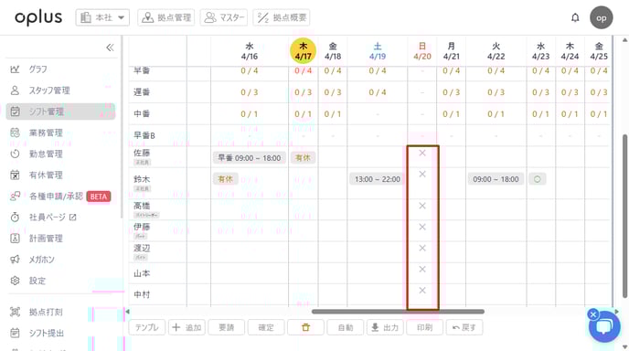 設定を行うとシフト上では「×」が表示され、該当の曜日は業務を追加することができなくなります。