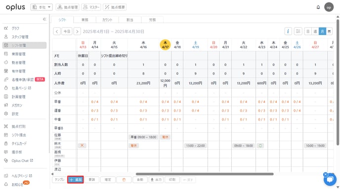 ・シフト管理画面下の「+追加」をクリック