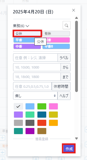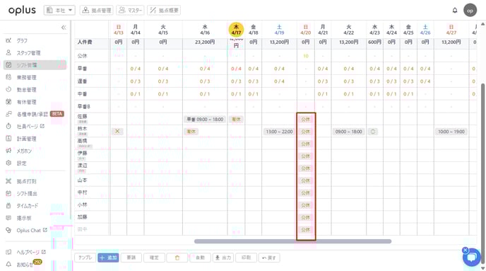 スタッフの公休数を管理したい場合は、業務管理から公休を設定することを推奨しております。
