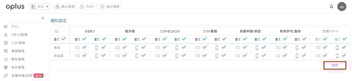 通知設定 下記設定にてメール通知やプッシュ通知をとめることが可能となります。 ▼設定方法 ・画面右上にあるアイコンをクリック ・「通知設定」をクリック ・通知を外したいチェックを外し「編集」をクリック ※労務アラートは「設定>勤怠」にて「日別/月別労務アラート」を設定すると設定が可能となります。
