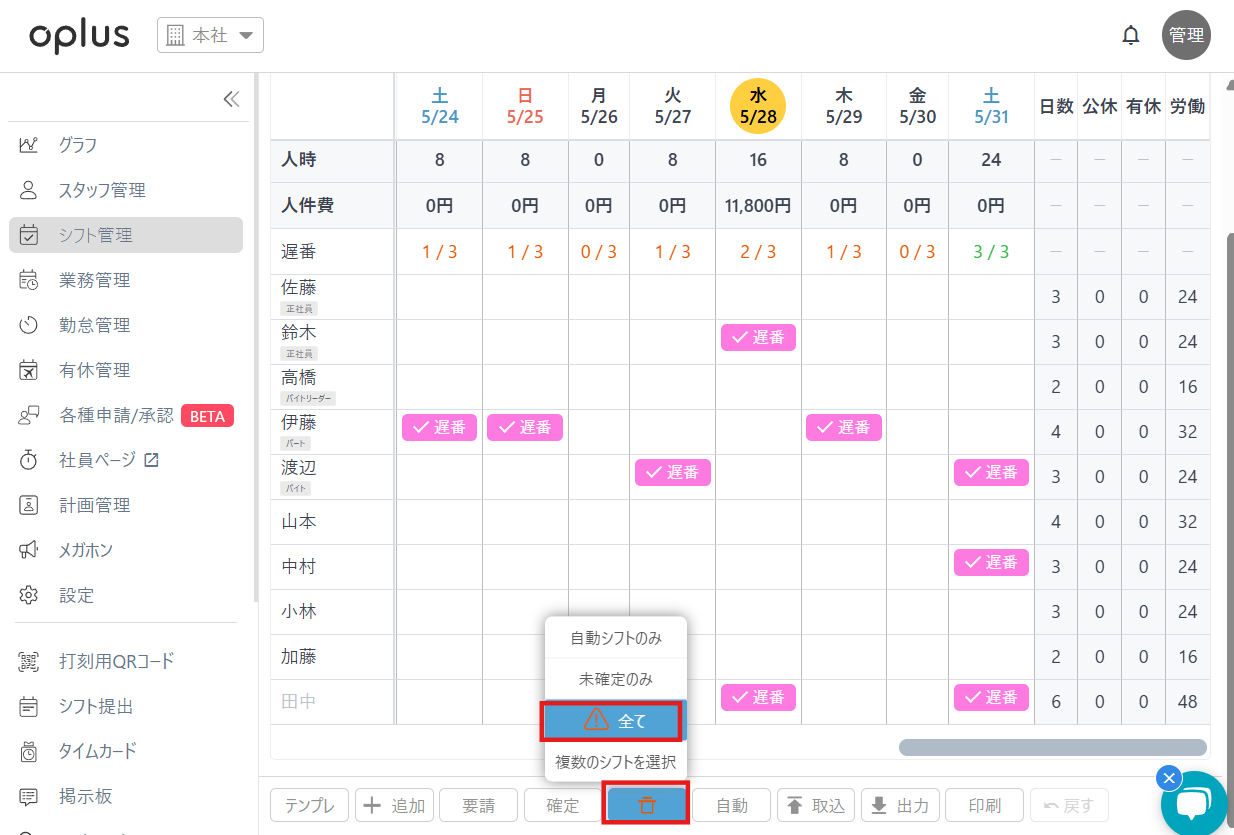 ・フィルターをかけたまま(該当の業務を表示したまま)ごみ箱マークより「全て」のシフトの削除を行う