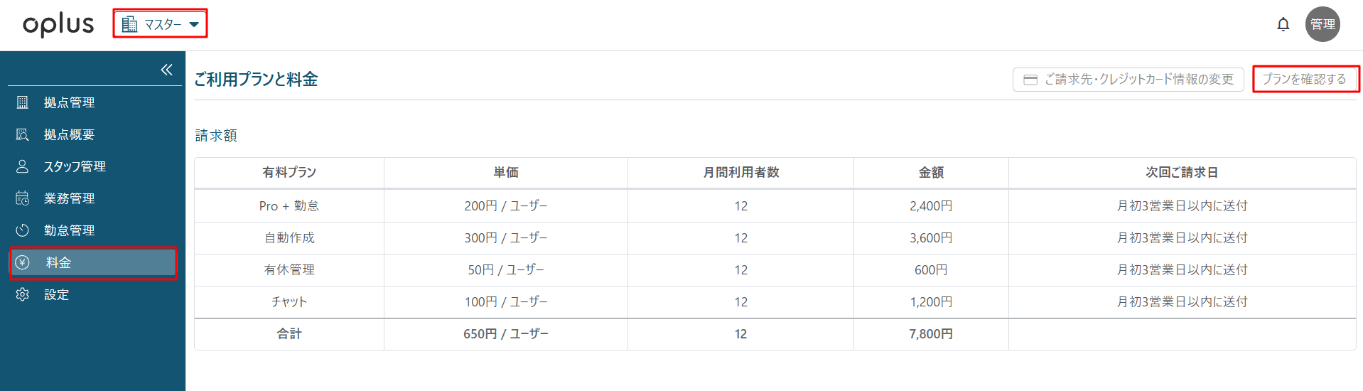 ・料金ページを開き、右上の「プランを確認」をクリック