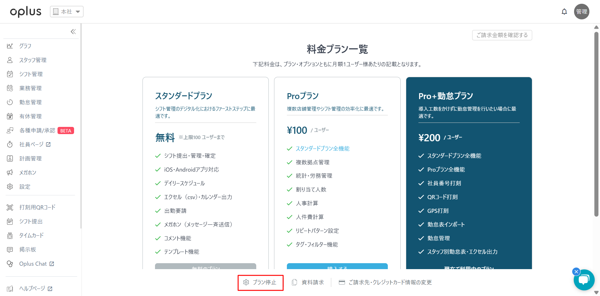 ・左下の「プラン停止」をクリック