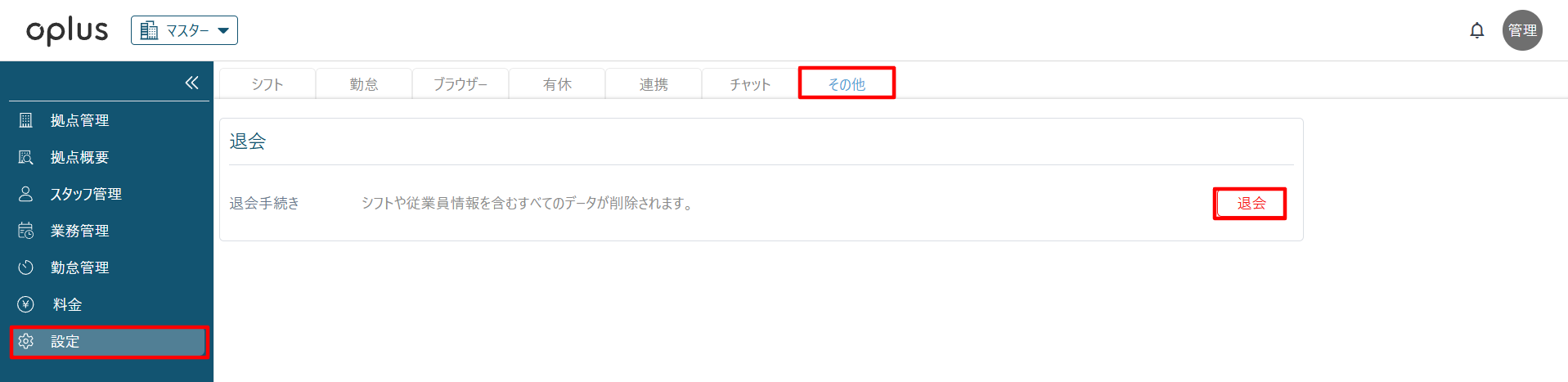 ・画面上部にある拠点名の記載がある「プルダウン>マスター」をクリック