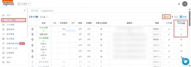 スタッフ表の「Money Forwardマネーフォワード クラウド勤怠」の列にチェックマークが表示されれば連携可能です。