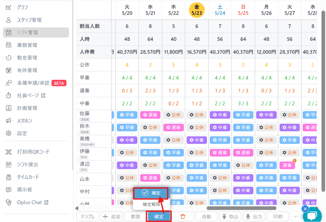 ・oplusのシフト管理にて「確定」を押しているか