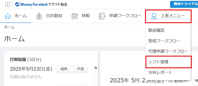 ・「上長メニュー>シフト管理」をクリック