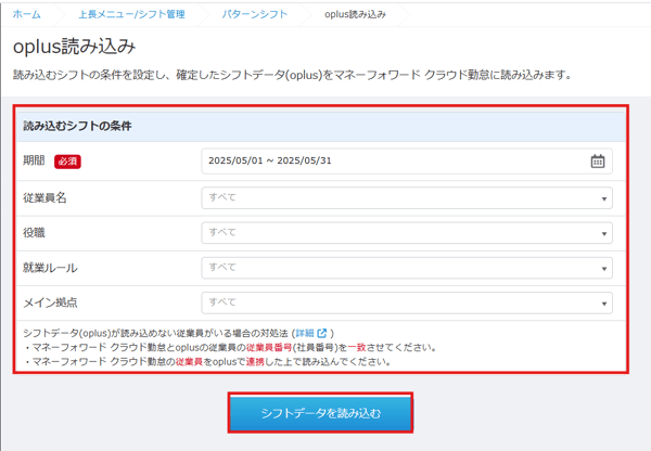 シフトデータの読み込みはoplus側でシフト確定を行ってから実行してください。