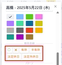 ・ 簡易登録:〇、✕、有休、半有休、法定休日、法定外休日