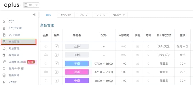 ・ シフト、希望休、公休などをすべて「業務管理」の業務に登録