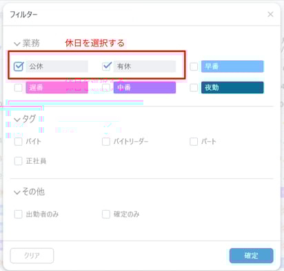 ・右上にあるフィルターをクリックし「シフト以外の業務のみ」を選択し絞りこむ