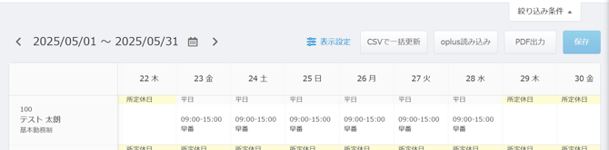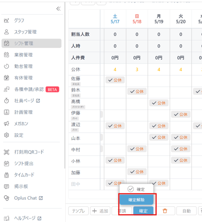 シフトデータの連携は、oplusにて「確定」を行ったシフトが対象となります。